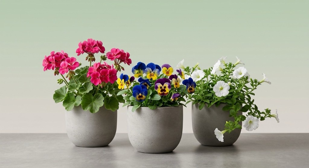 Kwiaty do skrzynek i wiszących donic: pelargonie, surfinie, lobelie oraz bratki (wiosną) i wrzosy (jesienią).