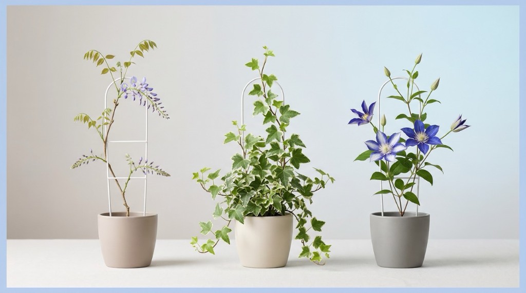 Rośliny pnące na płoty i pergole: powojniki (clematis), bluszcz pospolity, wiciokrzewy i glicynie.