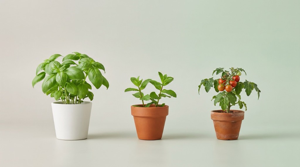 Sadzonki i świeże rośliny: pomidory, papryki oraz świeże zioła w doniczkach (mięta, bazylia, rozmaryn).