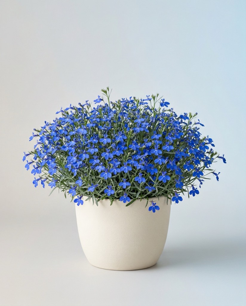 Delikatne kwiaty w zgrabnych kępkach. Lobelie tworzą drobny, elegancki efekt i pięknie wypełniają kompozycje.